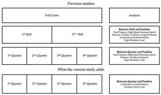 The between-position differences for the full game and per half were previously reported in hurling at U17 [20], U21 [2] and senior [1,8,9]. The per quarter match-demands in senior hurling showed that all positions experienced a temporal decrement in all metrics in at least one quarter except midfielders’ total distance and full-forwards’ high-speed running [16]. However, no data exists for the number of accelerations and decelerations and dynamic stress load between quarters within positions. Therefore, the aims of the current study were to describe the differences in the number of accelerations and decelerations and dynamic stress load between quarters of match-play and within playing positions in elite senior hurling. A graphical representation of what the current study will add to the literature is displayed in Figure 1. It was hypothesized that the number of accelerations and decelerations and dynamic stress load would decrease as the match progresses. Furthermore, it was hypothesized that there would be a temporal decrement within position between quarters.