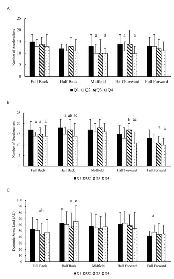 Mean ± SD of (A) the number of accelerations, (B) decelerations and (C) the dynamic stress load per quarter. Q = quarter; AU = Arbitrary units; a = different from quarter 1; b = different from quarter 2; c = different from quarter 3.