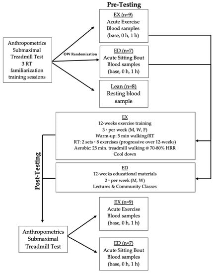Experimental timeline including pre-training acute exercise testing, 12 weeks of exercise training (EX) or educational materials (ED) exposure, and then post-training acute exercise testing. Abbreviations: Lean, lean controls; OW, overweight/obese participants; RT, resistance training; M, Monday; W, Wednesday; F, Friday; base, baseline; 0 h, immediately post-exercise; 1 h, 1 h after exercise.