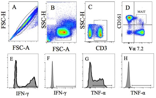 Representative Image of MAIT Cell Gating Strategy. Cells were gated as (A). Singlets, then as (B). lymphocytes, followed by (C). CD3+T Cells, and then (D). CD161/Vα7.2 T Cells (MAIT-cells). Intracellular MAIT-cell cytokine levels were determined following stimulation for (E). IFN-λ positive and (F). negative control and (G). TNF-α positive and (H). negative control.