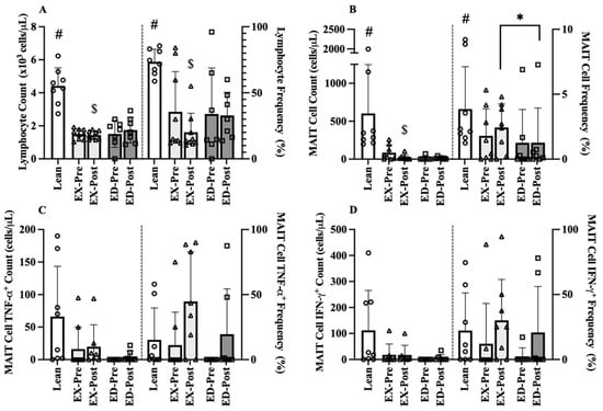 Pre-Training (Pre) and Post-Training (Post) resting immune cell counts and frequencies for Lean, exercise training (EX) and education (ED) groups. (A) Lymphocyte counts (left) and frequency (right) (B) MAIT-cell counts and frequency, (C) TNFα+ MAIT-cell counts and frequency, and (D) IFNγ+ MAIT-cell counts and frequency in age-matched Lean vs. overweight (OW) women at rest before and after training. Data are mean (SD). Abbreviations: MAIT, mucosal associated invariant T-cells; EX, exercise training group; ED, education group; Pre, pre-training; Post, post-training. # p < 0.05 vs. OW Pre; $ p < 0.05 vs. Lean; * p < 0.05 vs. EX Post.