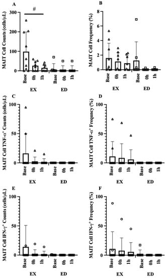 MAIT cell acute exercise response (A) MAIT-cell count acute exercise response (EX vs. ED), (B) MAIT-cell frequency acute exercise response (EX vs. ED), (C) MAIT-cell TNFα+ count acute exercise response (EX vs. ED), (D) MAIT-cell TNFα+ frequency acute exercise response (EX vs. ED), (E) MAIT-cell IFNγ+ count acute exercise response (EX vs. ED), (F) MAIT-cell IFNγ+ frequency acute exercise response (EX vs. ED). Data are mean (SD). # p < 0.05 vs. ED.