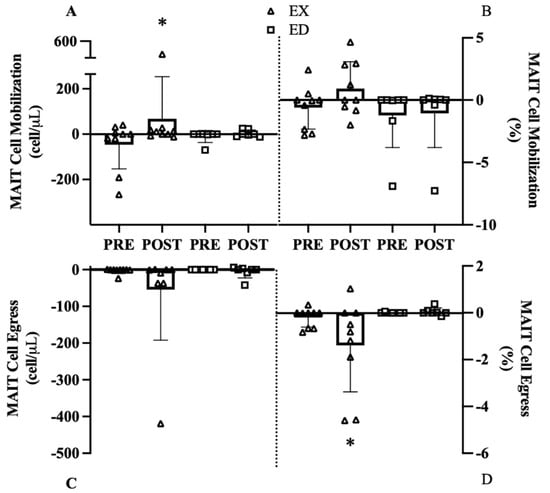 MAIT cell mobilization and egress before (Pre) and after (Post) exercise group (EX) or education group (ED). (A) MAIT-cell count mobilization, (B) MAIT-cell frequency mobilization, (C) MAIT-cell count egress, (D) MAIT-cell frequency egress. * p < 0.05 vs. Pre.