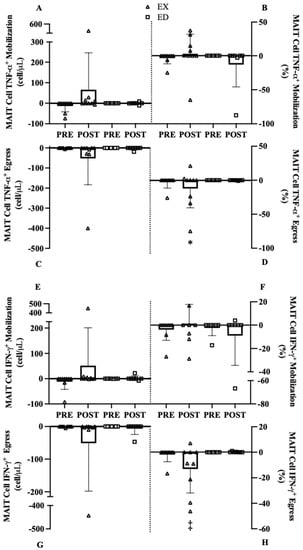 MAIT cell mobilization and egress of MAIT cells expressing TNF-α or IFN-γ before (Pre) and AFTER (Post) exercise training (EX) or education controls (ED). (A) MAIT-cell TNF-α+ count mobilization, (B) MAIT-cell TNF-α+ frequency mobilization, (C) MAIT-cell TNF-α+ count egress, (D) MAIT-cell TNF-α+ frequency egress, (E) MAIT-cell IFN-γ+ count mobilization, (F) MAIT-cell IFN-γ+ frequency mobilization, (G) MAIT-cell IFN-γ+ count egress, (H) MAIT-cell IFN-γ+ frequency egress. * p < 0.10 vs. Pre, ‡ p < 0.05 vs. Pre.