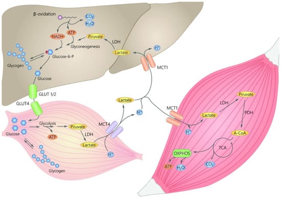 High-intensity exercise is characterized by the predominance of extramitochondrial pathways of energy production (i.e., phosphagen system and glycolysis), which drive the subsequent production and accumulation of hydrogen ions (H+), with the associated decrease in pH within fast-twitch muscle fibers []. It is this accumulation of H+ and other metabolites (Pi and poor Ca2+ handling) in the active skeletal muscle, and not the La− concentration per se, which is linked to the acute reduction in force and power (muscle fatigue) [,]. Actually, due to the high energy requirements of the working muscle during physical exercise, a family of proton-linked symporters called monocarboxylate transporters (MCTs, also known as the SLC16A family) has been proposed as an important mediator of the exchange between La− producer (driver) and La− recipient (consumer) cells in intracellular, cell–cell, and tissue–tissue La− shuttles in muscle, liver, heart, kidneys, and brain []. For example, La− turnover involves the recycling process in the liver through Cori’s cycle, which provides glucose to the working skeletal muscle []. In particular, the MCT4 serves as the 1:1 transmembrane cotransport of La− and H+ from muscle to the blood, while the MCT1 isoform is responsible for La− uptake from the circulation. The latter enters the mitochondrial reticulum to support cell energy homeostasis via oxidative phosphorylation of ADP and creatine [,]. In this sense, during an endurance physical effort (where the predominant energy source is oxidative phosphorylation), La− has shown an inhibitory effect on both lipolysis in adipose tissue (via certain G-coupled protein receptors, such as GPR81, and subsequent CREB activation) [] and fatty-acid uptake in muscle (through the rise in malonyl-CoA, which inhibits carnitine palmitoyl transferase-1) []. Therefore, La− may also regulate lipid oxidation and fuel utilization throughout exercise. Indeed, repeated La− exposure and accumulation in active tissues from regular exercise results in adaptive processes such as mitochondrial biogenesis and improved metabolic flexibility []. Thus, the two isoforms of MCT1 and MCT4 are important La−/H+ cotransporters which are involved in the regulation of muscle pH and energy metabolism [] (Figure 1).