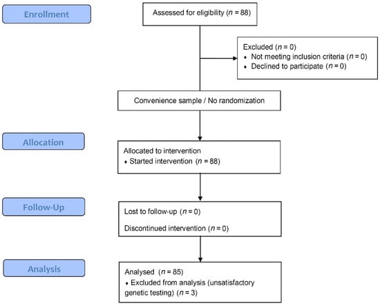 We evaluated and analyzed the results obtained from 85 endurance-trained males (age: 39.2 ± 7.9 years; body mass: 73.2 ± 7.2 kg; stature: 176.7 ± 5.9 cm). Three individuals were withdrawn by the researchers due to unsatisfactory genetic testing results. Figure 1 shows the selection, grouping, and final data analysis of the individuals in a flow diagram.