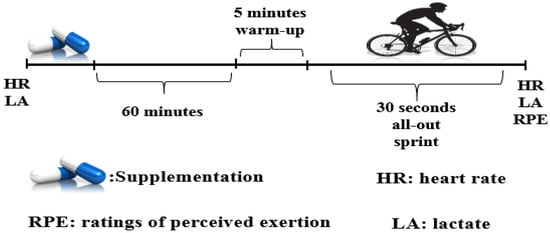 This double-blind, randomized and crossover study consisted of five separate testing sessions: a familiarization session and four experimental trials with ingestion of isolated CAF or TAU, the combination of these two substances (CAF+TAU) or a placebo (PLA). Peak power (PP), mean power (MP) and fatigue index (FI) were measured during the 30-s WAnT, which was performed 60 min after the oral ingestion of the substances to allow absorption [5,7]. Heart rate (HR; Polar Team 2 telemetric system, Finland) and capillary lactate (BL; Lactate Scout, USA) were measured before and immediately after the WAnT. Ratings of Perceived Exertion (RPE) was measured immediately post-exercise with the 6–20-point scale [22]. All testing took place between 8.00 am and 9.00 am in a fasted state (12 h after the last meal) and trials were separated by at least 48 h to allow substance elimination. Participants were asked to refrain from vigorous exercise and CAF intake from both foods and supplement sources, and to maintain normal dietary patterns in the 24 h prior to testing. The menstrual cycle phase of the participants was not considered because sprint cycling performance has been shown to be improved with CAF to a similar magnitude with CAF supplementation in the follicular, pre-ovulatory and mid-luteal phases [18]. The test procedures are summarized in Figure 1.