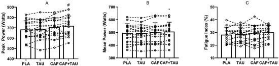 Peak cycling power (A), mean cycling power (B) and fatigue index (C) during the WAnT with the ingestion of taurine (TAU), caffeine (CAF), the combination of CAF+TAU or a placebo (PLA). *: CAF+TAU significantly different from PLA at p < 0.05; #: CAF+TAU significantly different from PLA and TAU at p < 0.05.