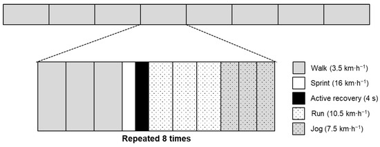 Upon completion of the 20 m trials, the mLIST was performed. The mLIST was ~15 min in duration, with eight identical blocks of activity performed. Each activity block consisted of 3 × 20 m walking bouts (3.5 km·h−1), 1 × 20 m sprinting bout (16 km·h−1; followed by 4 s of passive standing recovery), 3 × 20 m running bouts (10.5 km·h−1), and 3 × 20 m jogging bouts (7.5 km·h−1) with the pace of each bout dictated by audio cues. The assigned speeds were identical for both directions, and to enable the test to be completed successfully, selected speeds were appropriate for the backward direction [9]. Using the Team Beep Test iPhone application, the audio file was created using the assigned speeds for each type of displacement. A schematic of the mLIST is presented in Figure 1. Within 30 min of completing the mLIST, rating of perceived exertion (RPE) was collected from each participant using the 6–20 scale [22]. Accelerometer and heart rate data were downloaded from the microsensors using proprietary software (Catapult Sprint, v5.1.7; Catapult Innovations; Melbourne, Australia). Data were then manually separated according to the activity (walking, jogging, running, and sprinting) completed during the mLIST. The external load was determined using accumulated PlayerLoadTM, which has been described as the sum of a modified vector magnitude calculated as the square root of the sum of the squared instantaneous rate of change in acceleration across three planes multiplied by a scaling factor of 0.01 [23]. PlayerLoadTM relative to time (AU·min−1) was also determined for each phase of the mLIST given the differences in duration spent at each movement type during specific phases of the mLIST. The accelerometer devices used in this study have been shown to be reliable in a team sport with a coefficient of variation of less than 2% [23]. Internal load variables included RPE and mean heart rate (HRmean) for the entire mLIST. The validity and reliability of accelerometry-, heart rate-, and RPE-based load variables have been rated as moderate-high in a consensus statement [24].