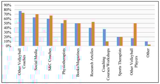 Percentage of coaches (blue) and players (orange) who obtain strength and conditioning information from different sources.