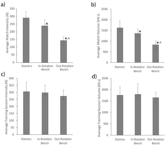 Average match intensity (a) and volume (b), and average training session intensity (c) and volume (d) for each player role. * represents a significant difference to starters (p < 0.05). ^ represents a significant difference to in-rotation bench players (p < 0.05). Error bars represent the upper and lower quartiles.