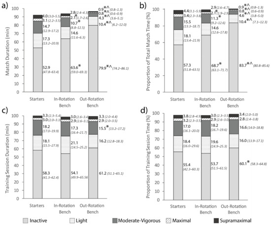 Total duration (a) and proportion of session time (b) spent in each intensity band in matches for each player role, and total duration (c) and proportion of session time (d) spent in each intensity band in training sessions for each player role. Adjacent values are presented as median (lower bound-upper bound). * represents a significant difference to starters (p < 0.05). ^ represents a significant difference to in-rotation bench players (p < 0.05).
