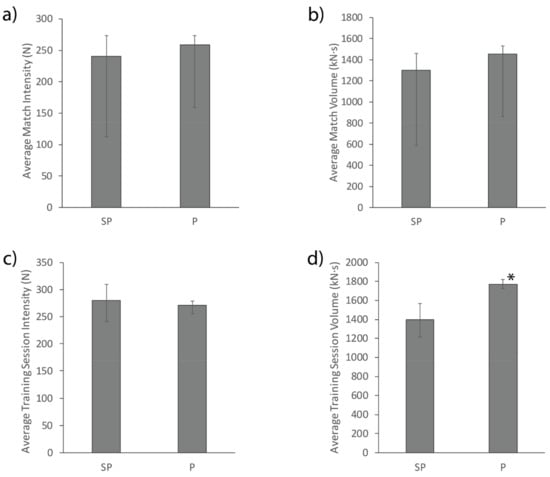 Average match intensity (a) and volume (b), and average training session intensity (c) and volume (d) for the semi-professional (SP) and professional (P) team. * Represents a significant difference to the semi-professional team (p < 0.05). Error bars represent the upper and lower quartiles.