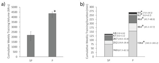 Average total weekly training volume (a) and total duration spent in each intensity band (b) for the semi-professional (SP) and professional (P) team. Adjacent values are presented as median (lower bound-upper bound). * Represents a significant difference to the semi-professional team (p < 0.05).