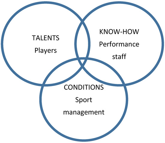 An elite player in team sports has a large number of characteristics that are in synergy with each other. The optimal levels of development of individual characteristics, as well as their mutual harmonization, are achieved by an integrated and personalized system of sports preparation [5]. The basic task of sports preparation is to enable players and teams to achieve the best sports performance in their competition. Elite sports achievements are reached through the long-term, systematic, and hard work of a large number of people who service athletes [6]. Sports coaches, strength and conditioning coaches, psychologists, medical doctors, physiotherapists, nutritionists, and sports analysts form multidisciplinary teams that base their work on interdisciplinary synchronization [7]. All these experts give their coordinated contribution to better optimize the sports teams’ system, as well as to the quality performance of each individual [8]. The contributions of each player to the team performance occur based on the wise leadership, management, and regulation of the head coach. The head coach, together with the general manager or sports director, selects the players, assigns them roles and responsibilities, determines the rules of conduct and action, and coordinates the professional staff members. At the same time, at the level of the sports organization management (club or federation), an interdisciplinary team of experts (ticket sales and sales manager, lawyer, accountant, community manager, marketing manager, graphic designer, administrators, insurance officer, etc.), led by the general manager and sports director, harmoniously provide optimal conditions for sports preparation for teams, players, and staff members [9]. In this way, at the same time, different but interconnected processes occur with the unique goal of achieving the best possible sports outcome (Figure 1).