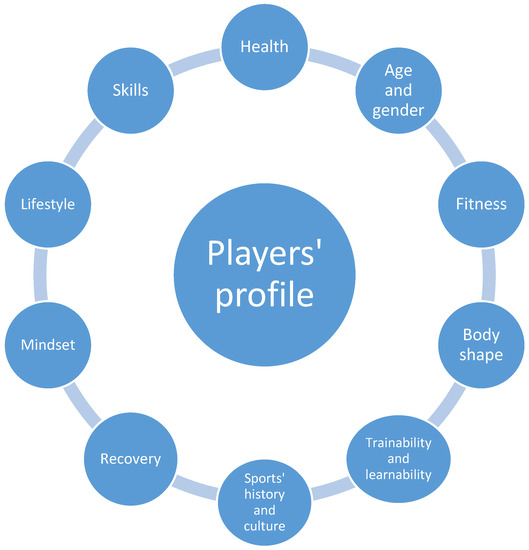 The individual characteristics of the players need to be identified multidimensionally, but in an integrated way [4]. In this sense, sports performance arises as a result of the integrative procedures of the competition, training, and recovery of an athlete through their sports development cycle (career) [10,11]. In order to embark on a synergistic process of integrating all the athlete characteristics, it is important to understand which characteristics describe an individual athlete profile (Figure 2).