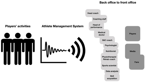 It is especially important to determine the method of communication within the expert team, i.e., the communication algorithms and procedures [49]. This is important because of the need to rationalize the data collections, processing, and communication of large amounts of information that describe the daily state of readiness and activities of each athlete. Therefore, there is a clear need to have optimized solutions that are designed by data architects, data engineers, and data analysts in a way that centralizes all data to be processed such that it is later available according to the personal needs of each expert staff member or even the players.
