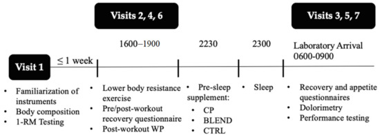 The present study followed a randomized, single-blind, crossover design (Figure 1). During the first laboratory visit (familiarization), participants’ body composition was assessed via non-invasive Biodynamics™ bioelectric impedance analysis (Biodynamics Corp., Shoreline, WA, USA). Participants were familiarized with exercises included in the resistance exercise protocol, and 1 repetition maximums (1-RM) were assessed for both the leg extension and the horizontal leg press. Baseline measures of peak torque and average power were assessed via Biodex™ isokinetic dynamometry (Biodex System 4, Biodex Medical Systems, Inc., Shirley, NY, USA) in order to familiarize participants with the system. After the first laboratory visit, participants completed 3 experimental trials separated by at least 72 h. A trial is denoted by 2 subsequent laboratory visits. Visits 2, 4, and 6 consisted of the completion of resistance exercise protocol and visual analogue scale (VAS) measurements of recovery. Visits 3, 5, and 7 consisted of VAS measurements of recovery and appetite, isokinetic dynamometry, and pain-pressure threshold. The average time between experimental trials was 111 h ± 40. All visits are described in greater detail below.