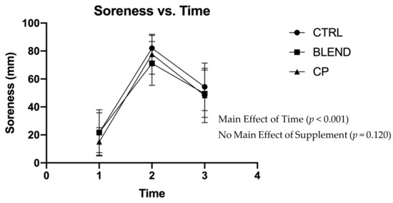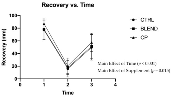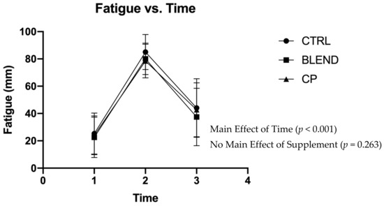 Subjective assessments of recovery, soreness, and fatigue were analyzed via repeated measures two-way ANOVA. Data are presented in Figure 2, Figure 3 and Figure 4. There were no significant supplement x time interactions among recovery (F4,56 = 0.383; p = 0.820; partial eta squared (ηp2) = 0.027), soreness (F4,56 = 1.063; p = 0.383; ηp2 = 0.071), or fatigue (F4,56 = 0.358; p = 0.837; ηp2 = 0.025). Analysis revealed no main effect of supplement on self-assessed fatigue (F2,28 = 1.399; p = 0.263; ηp2 = 0.091) or soreness (F2,28 = 2.291; p = 0.120; ηp2 = 0.141). Pairwise comparisons revealed no statistically significant differences between supplement groups for self-assessed fatigue (p >0.05) and soreness (p > 0.05). There was, however, a main effect of supplement on self-assessed recovery (F2,28 = 4.869; p = 0.015; ηp2 = 0.258). Pairwise comparisons revealed a significant difference between CP vs. CTRL (p = 0.005) and CP vs. BLEND (p = 0.033), with recovery being 6.10 ± 2.58 mm greater for CP than the blend, and 7.51 ± 2.28 mm greater for CP than CTRL. As expected, there was a main effect of time for recovery (F2,28 = 96.753; p < 0.001; ηp2 = 0.874), fatigue (F2,28 = 76.775, p < 0.001; ηp2 = 0.846), and soreness (F2,28 = 111.967, p < 0.001; ηp2 = 0.889).