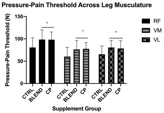 Data collected via dolorimeter to assess pressure-pain threshold were analyzed via within-factors ANOVA. Data are presented in Figure 5. There was a main effect of supplement at the rectus femoris (RF) (F2,28 = 9.377, p = 0.001; ηp2 = 0.401), the vastus lateralis (VL) (F2,28 = 10.887, p < 0.001; ηp2 = 0.437), and the vastus medialis (VM) (F2,28 = 12.113, p < 0.001; ηp2 = 0.464). Pairwise comparisons revealed a significant difference between CP vs. CTRL at the RF (p = 0.005), the VL (p = 0.007), and the VM (p = 0.003). These comparisons also revealed a significant difference between BLEND vs. CTRL at the RF (p = 0.002), the VL (p < 0.001), and the VM (p = 0.002). There was, however, no significant difference between CP vs. BLEND at the RF (p = 0.952), the VL (p = 0.523), or the VM (p = 0.471).