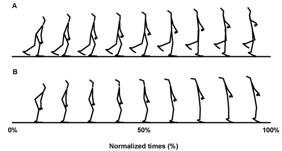 Typical stick images representing the pull phase from a sagittal view. (A): One-leg HPC. (B): Two-leg HPC. HPC, hang power clean.