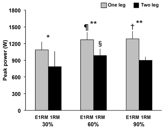 Peak power during the pull phase of a one- and two-leg hang power clean. *: Greater than the two-leg condition (p < 0.01). **: Greater than the two-leg condition (p < 0.001). †: Greater than 30% 1RM (p < 0.05). ¶: Greater than 30% 1RM (p < 0.01). §: Greater than 90% 1RM (p < 0.05). E1RM, estimated one-repetition maximum; 1RM, one-repetition maximum.