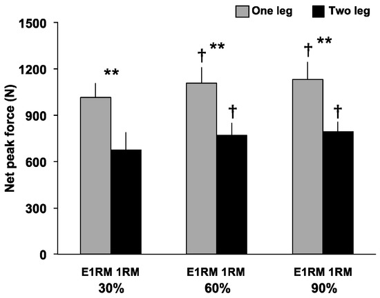 Peak force during the pull phase of a one- and two-leg hang power clean. Peak force during the pull phase of one- and two-leg hang power clean. **: Greater than the two-leg condition (p < 0.001). †: Greater than 30% 1RM (p < 0.05). E1RM, estimated one-repetition maximum; 1RM, one-repetition maximum.