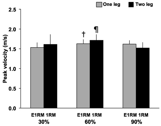 Peak velocity during the pull phase of a one- and two-leg hang power clean. Peak velocity during the pull phase of one- and two-leg hang power clean. †: Greater than 30% 1RM (p < 0.01). ¶: Greater than 90% 1RM (p < 0.01). E1RM, estimated one-repetition maximum; 1RM, one-repetition maximum.