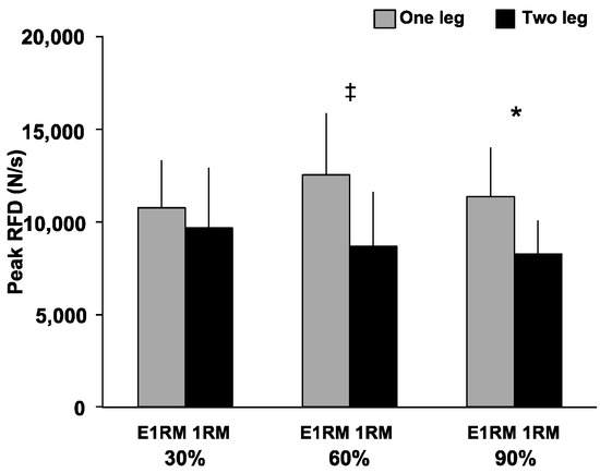 Peak RFD displayed significant differences between loads in both HPCs, as per previous studies [1,4]. Furthermore, there was only a significant difference between some loads at 30–85% 1RM [6]. Thus, peak RFD is more likely to be unaffected by load in the THPC [4]. Based on these reports, it seems that peak RFD with increased load is less likely to be affected in either HPC. Therefore, when using the HPC as a weightlifting exercise to improve the ability to exert high force in a short time, heavy loads may not be required.