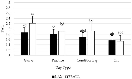 A significant main effect was observed (p = 0.010) between sports regardless of type of day with BBALL athletes having a significantly higher PAL than LAX athletes. When examined by individual sport and day type (Figure 3), significant differences (p < 0.05) were observed for BBALL athletes for all days with the exception of conditioning and practice days (p = 0.880). PAL was significantly higher on game days, compared to practice (p < 0.001), conditioning (p = 0.023) and off days (p < 0.001), with off days being significantly lower than game (p < 0.001), practice (p < 0.001) and conditioning (p = 0.022) days. For LAX athletes, a significant difference was observed between game, conditioning and off days with game days producing significantly higher PAL values than conditioning (p = 0.002) and off (p < 0.001) days. Practice days were significantly higher than both conditioning (p = 0.003) and off (p < 0.001) days, while off days produced significantly lower (p < 0.001) PAL values than every other day.