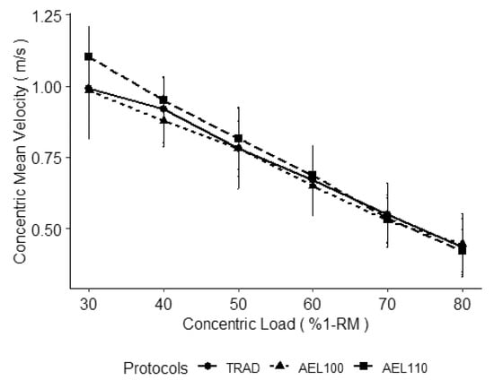 Statistical procedures were performed in R version 3.6.2 (R Foundation, Vienna, Austria, https://www.R-project.org, accessed on March 2020) with an alpha level of p < 0.05. Data were not normally distributed. Thus, to understand the influence of AEL on mean concentric velocity, non-parametric hierarchical (multilevel) linear modeling approaches were used via the ‘nlme’ package []. The repeated measures were assessed from concentric loads (level 1) and were nested within subjects (level 2). Explanatory predictor variables included concentric load, AEL100, AEL110, and displacement during the bench press. One model was conducted with 30% 1-RM as the intercept, while another was conducted with 80% 1-RM as the intercept to analyze the effects at the lightest and heaviest loads.