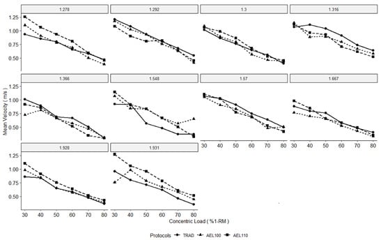 Results from the multilevel models are presented in Table 1, group mean velocities are displayed in Figure 1, and individual data are presented in Figure 2. During 30% and 80% 1-RM concentric loads, AEL100 resulted in faster concentric velocities. However, as the displacement of the bar travel increased between individuals, the increase in concentric velocity due to AEL100 was decreased. When collapsed across all protocols, individuals achieving a greater displacement of the barbell achieved faster mean velocities during the bench press. Accentuated eccentric loading with 110% 1-RM resulted in a more negative slope of velocity across concentric loads from 30–80% 1-RM. Yet, concentric velocity during AEL110 was not significantly different than TRAD during 30% (p = 0.077) or 80% 1-RM (p = 0.543) concentric loads.