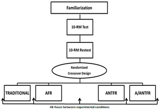 A randomized crossover clinical trial was conducted. Seven visits were made; the first being for the acquisition of anthropometric data, familiarization with the standardized execution of the exercises, and instructions on the data collection procedures. In addition, all were instructed to perform a 30 s set of FR on the quadriceps and hamstrings to standardize the technique. The next two sessions were intended to test and retest the 10 RM load for the leg extension. In order to verify the total training volume (TTV), total repetitions (TR), fatigue resistance index (FRI), and muscle soreness (MS), the subjects participated in four experimental sessions through random entry in sessions separated by 48 h (Figure 1):