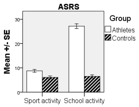 Data analysis was carried out to compare the two groups in terms of ASRS criteria, in leisure time and in the school environment. The processing of data was conducted using IBM SPSS Statistics for Windows, Version 24.0. (IBM Corp.: Armonk, NY, USA) A two-way analysis of variance (ANOVA) F-test was used to analyse differences between the groups (athletes vs. non-athletes) and pair-wise post-hoc comparisons with Tukey’s HSD test was used to compare the sport athletes during sports activities and school. Data were screened for normality and homogeneity of variances was tested using the Levene statistic.