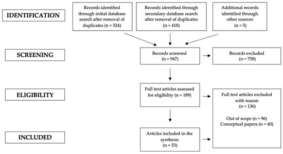 The final 53 articles were read multiple times in full to capture the focus of investigation, method, findings, inferences and implications of each study []. Following this, a two-stage thematic analysis was completed to identify consistent themes within the data [,]. First, deductive analysis was used to identify data that informed the research aims [,,]. Second, each study was rigorously explored and classified according to the perspectives that shaped the theoretical focus of investigation, the study design and/or the interpretation of the findings. This exploration enabled comparisons, similarities, and differences to be drawn between and within each perspective. There was a mix of quantitative and qualitative data sets across the 53 studies; therefore, to find a “middle ground” [], p. 809 a narrative approach to synthesis was adopted to integrate, interpret, and communicate the relevant findings [,].