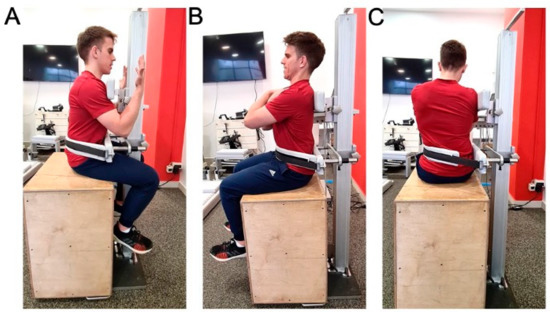 Medicine ball throws—sitting with back support (static trunk). Each participant took a sitting position on a weightlifting bench with raised backrest, with full feet resting on the floor and 90-degree of hip flexion. The back of a participant was upright throughout the throwing and the belt over the chest was firmly fixed to the backrest to prevent trunk movement. The throw was repeated if there was movement in the hip or trunk and if the feet rose from the ground. Each throw in 4 directions was performed 2 times, with a rest of 1 min between throws. In the further analysis, a better result of two throws per direction was used. The distance was measured in centimeters from the center of the seat to the point of first contact of the ball with the ground. (I) Static forward throw: the participant held the ball over his head with both hands, with abducted shoulders and flexed elbows, and then performed a forward throw. (II) Static backward throw: the participant held the medicine ball with both hands at navel height and then performed an overhead back throw. (III) Static side throw: the ball was held with both hands outside of the thigh, opposite to the throw side, and then performed the throw with minimal spinal rotation. The side throw was first performed to the right and then to the left. The stated order of all directions of throws with static trunk was the same for all participants.