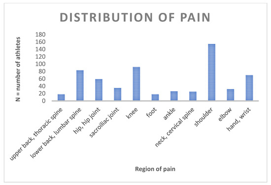 In our data we found that the shoulder region (59.6% of all those who suffered pain and 37.4% of all athletes) was given as the most common pain location. The knee region followed at a considerable distance (35.4% with pain and 22.2% of all), closely followed by the lumbar region (31.9% with pain and 19.8% of all) (see Figure 2).