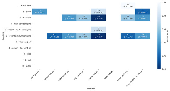 It was noticeable that the fact that they had mastered certain exercises showed a connection with the indication of pain. This connection between controlled exercise and significantly more pain in certain regions (see Figure 3) showed us most clearly how individually this sport must be viewed. It shows that it could only be certain movements in a certain sport that can lead to pain, which can be a precursor to structural damage.