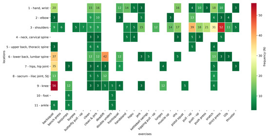 The last question asked gave information on those exercises that led to pain in individual regions when performed. They are given in a crosstab as descriptive statistics (see Figure 4). Shoulder pain was particularly common during the execution of a “strict press” (N = 52), “pull-up” (N = 39), and “snatch” (N = 31); pain in the lumbar region during the “deadlift” (N = 42) and “backsquat” “(N = 37); hip pain with the “backsquat” (N = 35); and knee pain also with the “backsquat ”(N = 56).
