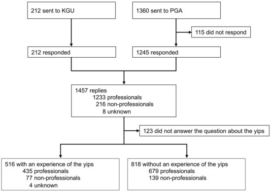 We surveyed highly skilled professional and non-professional golfers to clarify the epidemiological aspects of the yips and characterize yips-related symptoms, in collaboration with two of the largest golfers’ associations in Japan, the Professional Golfers’ Association (PGA) and the Kansai Golf Union (KGU), between June 2014 and August 2015. The PGA is the organization of golfers with a professional license in Japan; the KGU is a regional organization of highly skilled competitive amateurs. The surveys were conducted through monthly meetings and training workshops held by each association. A total of 1572 surveys were distributed to the following groups of participants: 1360 PGA members and 212 KGU members. In a training workshop conducted by the PGA, four non-professionals participated and answered the survey. Therefore, the survey involved 1356 professional and 216 non-professional golfers. Further details are shown in Figure 1.