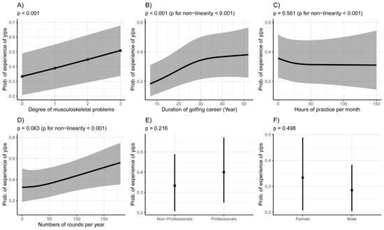 The characteristics of golfers with and without the experience of the yips are presented in Table 2. Approximately 39% of golfers experienced the yips. Golfers with an experience of the yips were older, had longer golfing careers and suffered from musculoskeletal problems more often than those without an experience of the yips. The factors associated with the experience of the yips are shown in Figure 2. The multivariate non-linear regression analysis revealed that having musculoskeletal problems (Figure 2A, p < 0.001) and a longer golfing career (Figure 2B, p < 0.001) were independent factors associated with the experience of the yips. Specifically, more severe musculoskeletal problems were associated with higher odds of having the yips (Figure 2A).