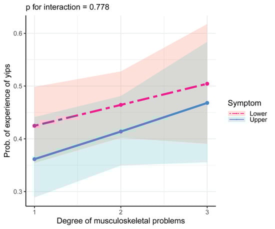 The impact of musculoskeletal symptoms with respect to the upper and lower body on the yips experience. The analysis revealed that there was no interaction between the upper and lower body’s musculoskeletal problems.