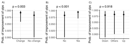 The results of the proportional odds logistic regression analysis are shown in Figure 4. When golfers experienced the yips, changing the training method and/or hitting style (Figure 4A, p = 0.003) and using an “other” strategy (Figure 4B, p < 0.001) were associated with an improvement in the yips. There was no statistical relationship between increasing or decreasing the amount of practice and improvement in the yips (Figure 4C, p = 0.92). The analysis revealed that there was an interaction between the professional golfers and taking an “other” strategy (Supplemental Table S3).
