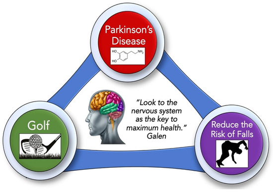 Playing golf may lessen the risk of falls in older adults with Parkinson’s disease (PD). The goal of this narrative review is to highlight the potential role of golf to reduce falls in older adults with PD. The flow of this paper follows the schematic above by describing Parkinson’s disease, a chronic neurodegenerative disease. Over time, PD develops due to the loss of dopamine-producing neurons in the brain (the chemical structure of dopamine is shown above), which greatly diminishes balance, posture and mobility. Older adults with PD have a substantially increased risk for falls compared to age-matched adults without PD. Our literature review found that golf could be an ideal form of exercise for lowering the risk of falls in older adults in general, but especially for those living with PD. The quote is attributed to Aelius Galenus (Anglicized to Galen). He was a prominent Greek physician-philosopher in the ancient Roman Empire who studied many aspects of medicine including anatomy and neurology [29].