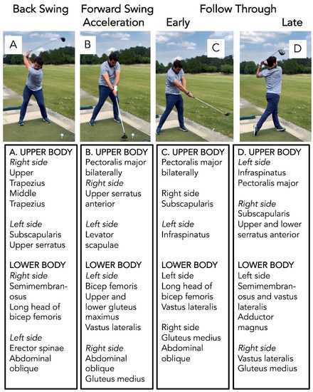 Golf is a sport that offers an all-around low-impact exercise [100,101,102]. The golf swing is a whole-body goal-oriented task that requires an extension, axial mobility, weight shift, coordination, transition of the body (over the base of support), and focus on visual-motor integration to allow the golf club to hit the golf ball [103,104]. The golf swing can be split up into five segments: (i) back swing (ball address to top of back swing); (ii) forward swing [top of swing to club horizontal (early part of down swing)]; (iii) forward swing acceleration [horizontal club to impact (late part of down swing)]; (iv) early follow through (impact to horizontal club); and (v) late follow through (horizontal to completion of swing) [105,106,107]. The complete golf swing not only promotes full range of bodily motion and axial rotation flexibility but activates many muscles in the body [100,101,102,103,104,105,106,107,108,109,110,111]. Shown in Figure 2 are the various major muscles used in the golf swing [107].