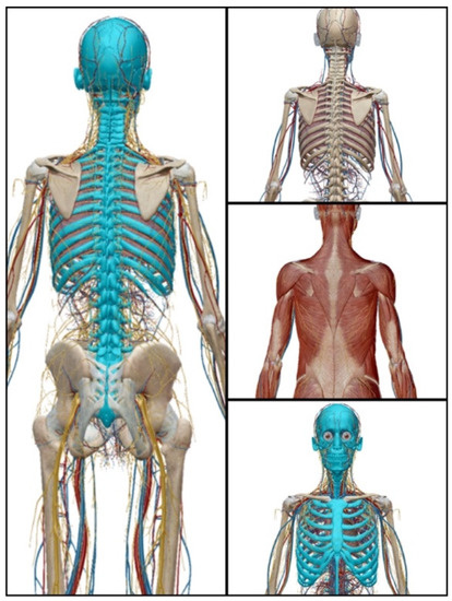 The axial skeleton region (highlighted in blue) along with the surrounding neurovascular and muscle supporting structures. This figure was prepared with permission from Human Anatomy Atlas (Version 2021) [iPhone software. from www.visiblebody.com (accessed on 7 April 2021)].