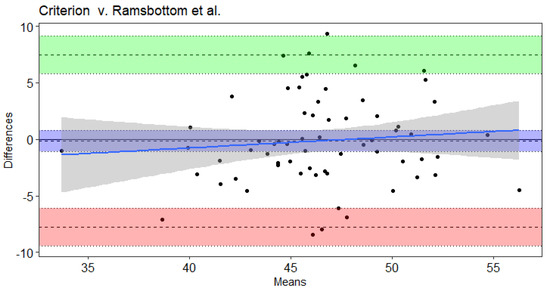 Bland–Altman plot of differences and means for criterion measured VO2max from a maximal incremental treadmill test and the Ramsbottom et al. Beep test algorithm. The 3 dotted lines with blue shading represent mean bias, green shading represents upper 95% threshold, and red shading represents lower 95% threshold. The center line is either the mean difference or [1.96 × SD of Differences]), while the dotted lines above and below the center are the respective 95% confidence intervals. The solid blue line and the gray shading represent the trendline of proportional bias and the proportional standard error of the slope estimates, respectively.