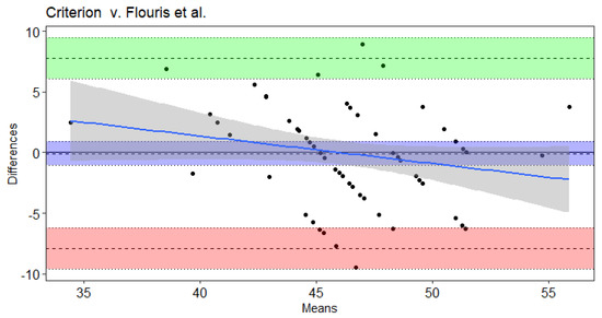 Bland–Altman plot of differences and means for criterion measured VO2max from a maximal incremental treadmill test and the Flouris et al. Beep test algorithm. The 3 dotted lines with blue shading represent mean bias, green shading represents upper 95% threshold, and red shading represents lower 95% threshold. The center line is either the mean difference or [1.96 × SD of Differences]), while the dotted lines above and below the center are the respective 95% confidence intervals. The solid blue line and the gray shading represent the trendline of proportional bias and the proportional standard error of the slope estimates, respectively.