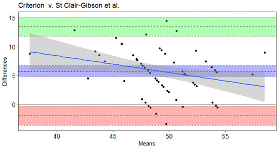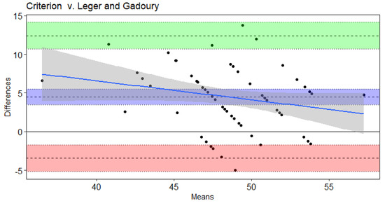 Results of the Bland–Altman and Least Products Regression analyses indicated true bias was not equal to 0 for Leger et al. [20], Leger and Gadoury [16], and St. Clair-Gibson et al. [18] (Table 4). The Ramsbottom et al. [15] (Figure 1) and Flouris et al. [19] (Figure 2) predicted VO2max did not note bias according to Ordinary Least Products Regression or Bland–Altman procedures (Table 4). Systematic bias was indicated with wide limits of agreement for St. Clair-Gibson et al. [18] (Figure 3), Leger and Gadoury [16] (Figure 4), Leger et al. [20] (Figure 5). Least Products Regression analyses (Table 3) displayed systematic and proportional bias for Leger et al. [20] (Figure 5), Chatterjee et al. [17] (Figure 6), and St. Clair Gibson et al. (Figure 3) [18].