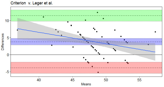 Bland–Altman plot of differences and means for criterion measured VO2max from a maximal incremental treadmill test and the Leger et al. Beep test algorithm. The 3 dotted lines with blue shading represent mean bias, green shading represents upper 95% threshold, and red shading represents lower 95% threshold. The center line is either the mean difference or [1.96 × SD of Differences]), while the dotted lines above and below the center are the respective 95% confidence intervals. The solid blue line and the gray shading represent the trendline of proportional bias and the proportional standard error of the slope estimates, respectively.